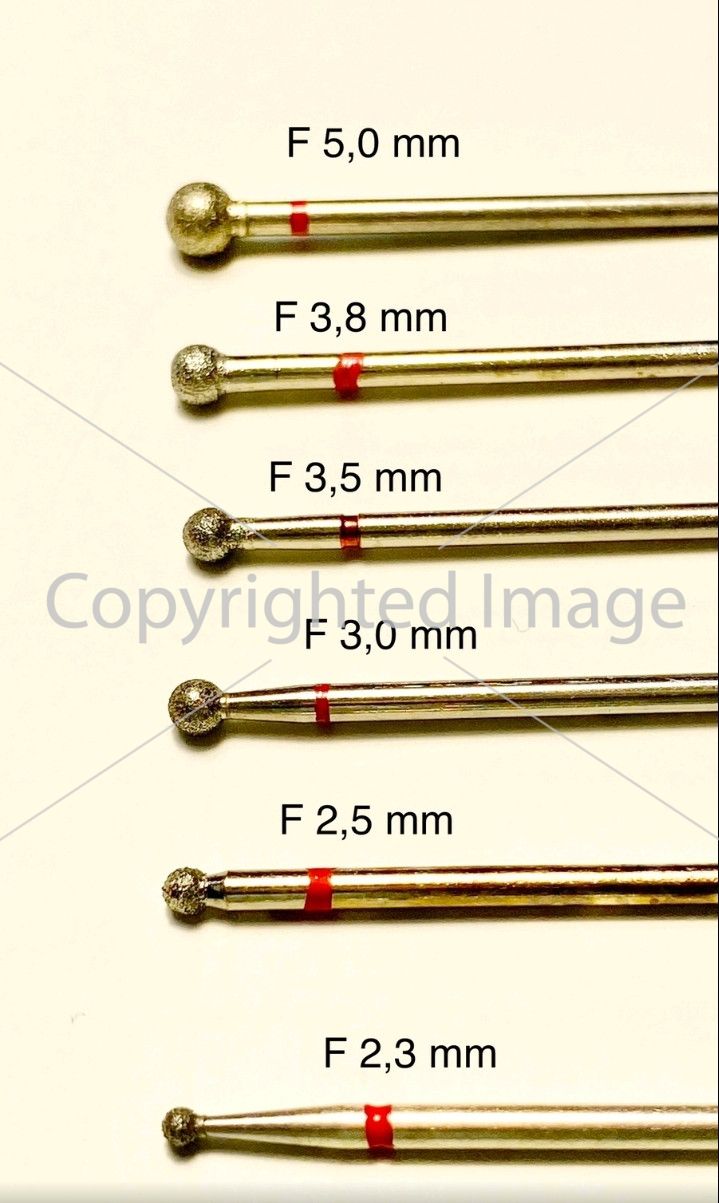 Фреза з алмазним напиленням Кулька (діаметр - 2,5 мм) застосовується для зрізу кутикули, бокових валиків і задирок. Кульки представлені в декількох діаметрах.