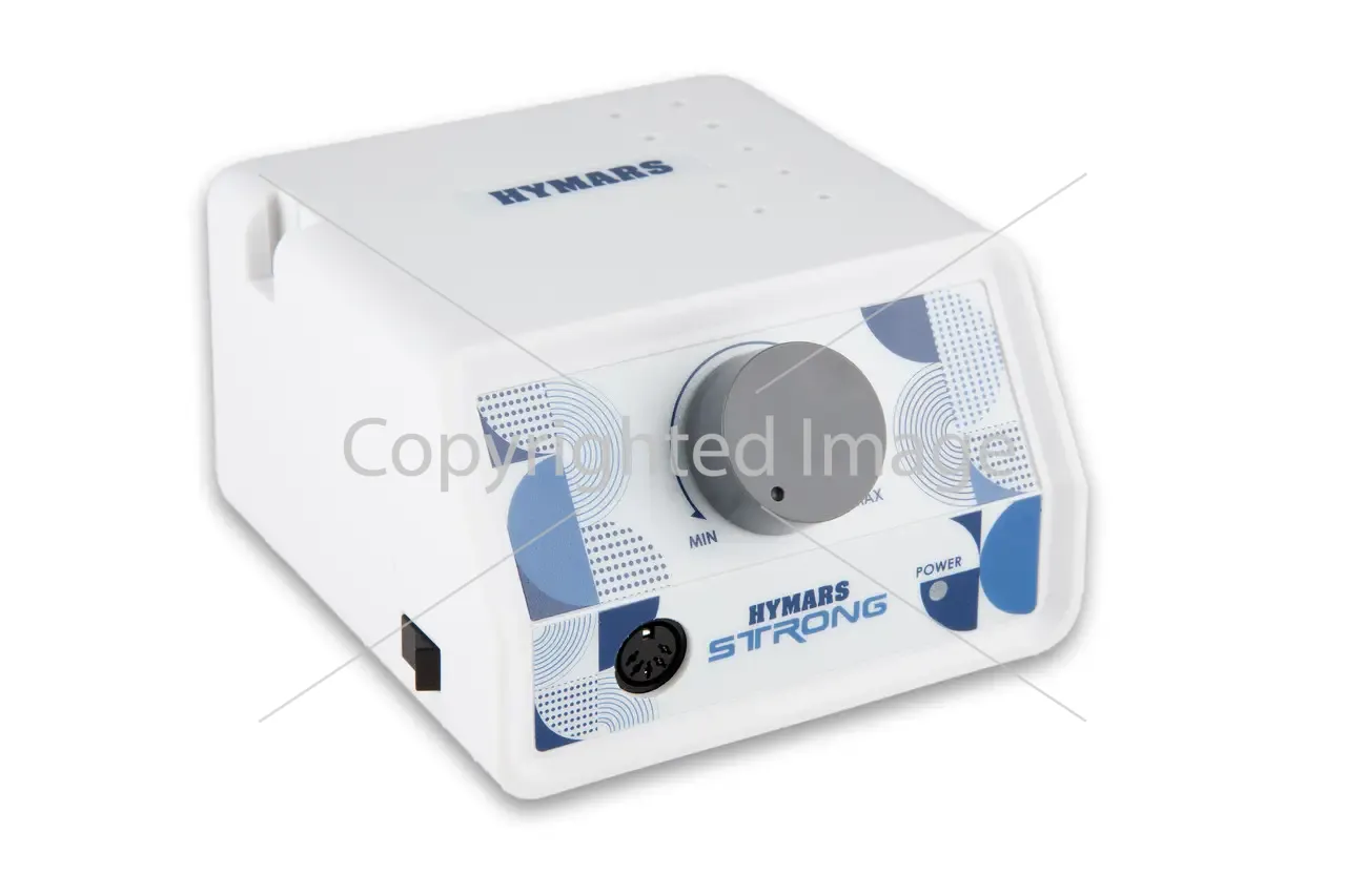 Опис Фрезер HYMARS модель Strong — це універсальний надійний апарат, що підходить для майстра манікюру та педикюру, для зубного техніка, ювеліра. Блок фрезера має підвищений захист від перегрівання та наявність автоматичної функції захисту від перевантаження — у разі перевантаження фрезер вимикається й не дає апарату вийти з ладу. Фрезер HYMARS Strong має функцію реверсу, яка дає змогу майстру працювати у двох напрямках, але не забувайте, що перемикання реверсу має здійснюватися тільки за вимкненого фрезера. Зміна напрямку під час роботи ручки може призвести до її ламання. На передній частині корпусу розташований роз'єм для під'єднання мікромотора, регулятор швидкості обертання фрези, кнопки OFF/ON і реверс. Фрезерний апарат укомплектований ручкою H37LN, максимальна робоча швидкість якої становить 40 000 об/хв, має невелику вагу 218 грамів і високий крутний момент 3.5 Н/см. З такими технічними характеристиками ручка може використовуватися не тільки для процедур манікюру, але й педикюру. Спрощений цанговий затискач Twist-Lock дає змогу змінювати насадки не більш ніж за 5 секунд. Для цього необхідно тільки провернути відповідну ділянку ручки вліво (відкриття цанги), замінити насадку та провернути ділянку назад (закриття цанги). Зверніть увагу! Не закривайте цангу без насадки. Це може призвести до зламання цангового затискача. Під час роботи ручка-мікромотор здійснює мінімальну кількість шуму та вібрації, тому майстру завжди комфортно працювати з нею. На корпусі розташовані кілька отворів для фрез, які майстер використовує найчастіше в роботі. Для цієї моделі фрезера передбачено керування ножем, яке можна вибрати (ручне або ножне) за допомогою перемикача «рука/педаль» на блоці. До комплекту також входить підставка-стаканчик, яка кріпиться до корпусу, настільна підставка для ручки фрезера, педаль для ножного керування Гарантія на ручку HYMARS H37LN-3 роки на блок HYMARS Strong -18 місяців