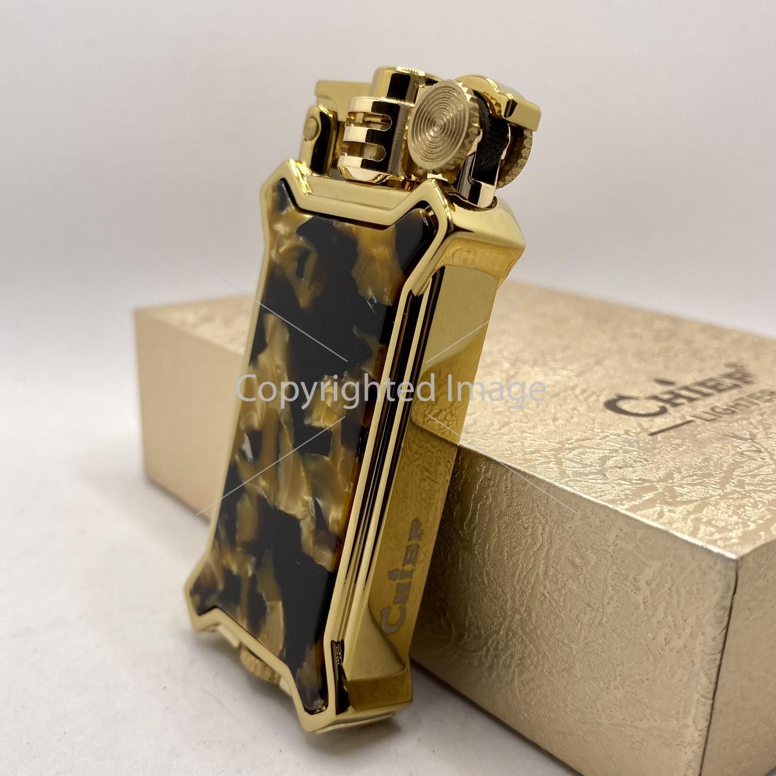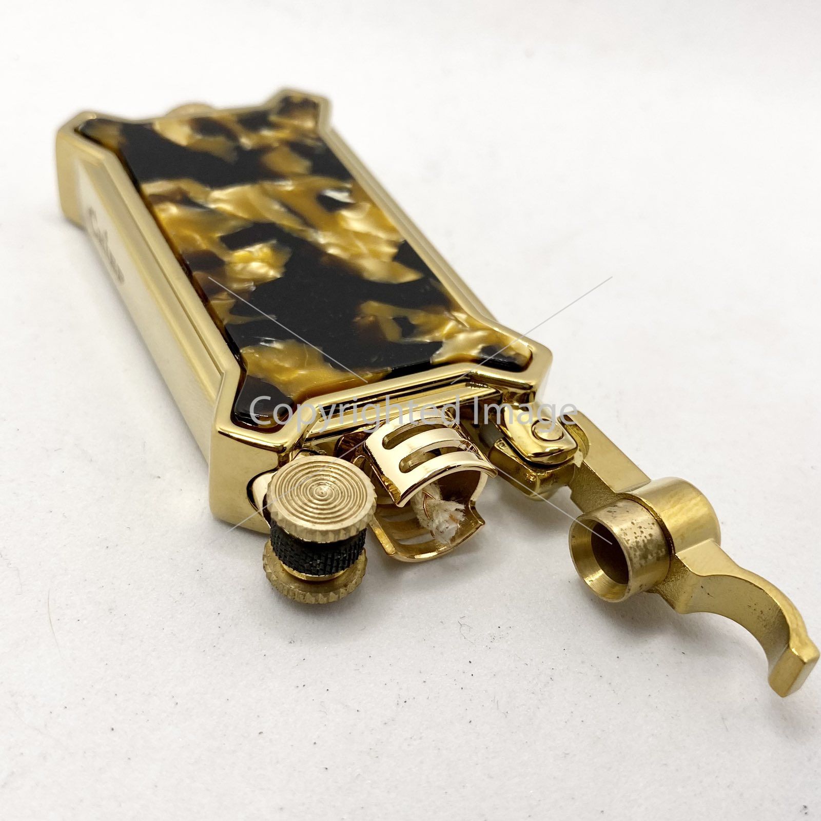 Витончене Оформлення: Глянцевий корпус кольору чистого золота служить ідеальним обрамленням для центральної панелі. Вставка з унікальним "черепаховим" візерунком додає глибини та ексклюзивності, роблячи кожну запальничку справжнім витвором мистецтва.