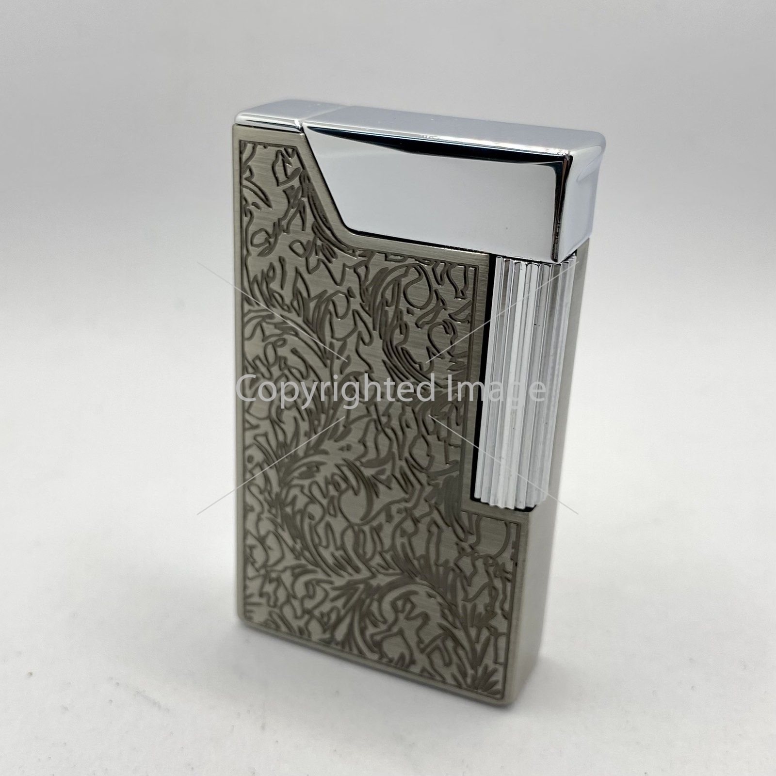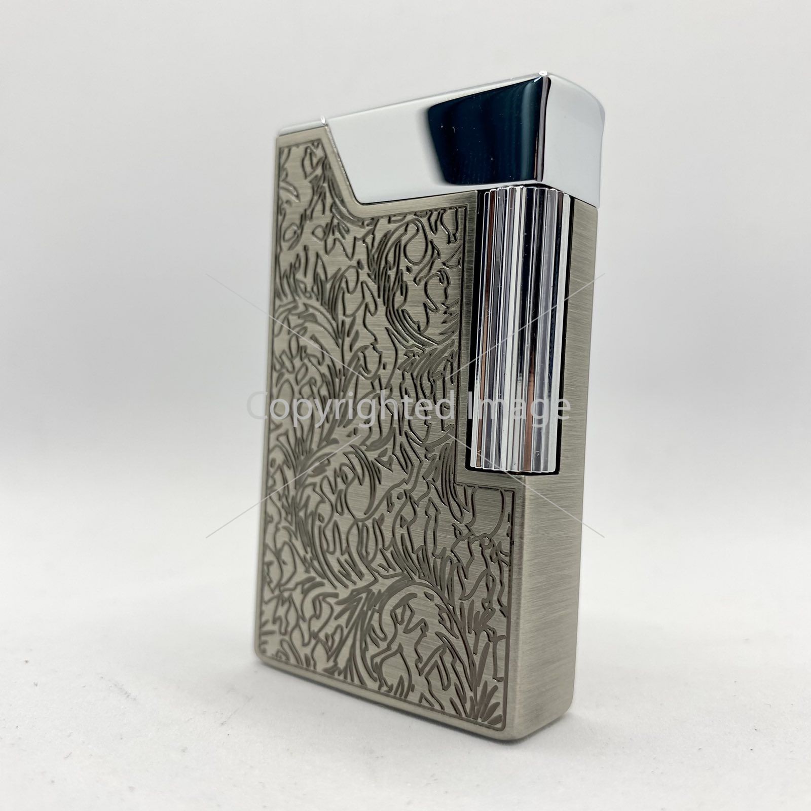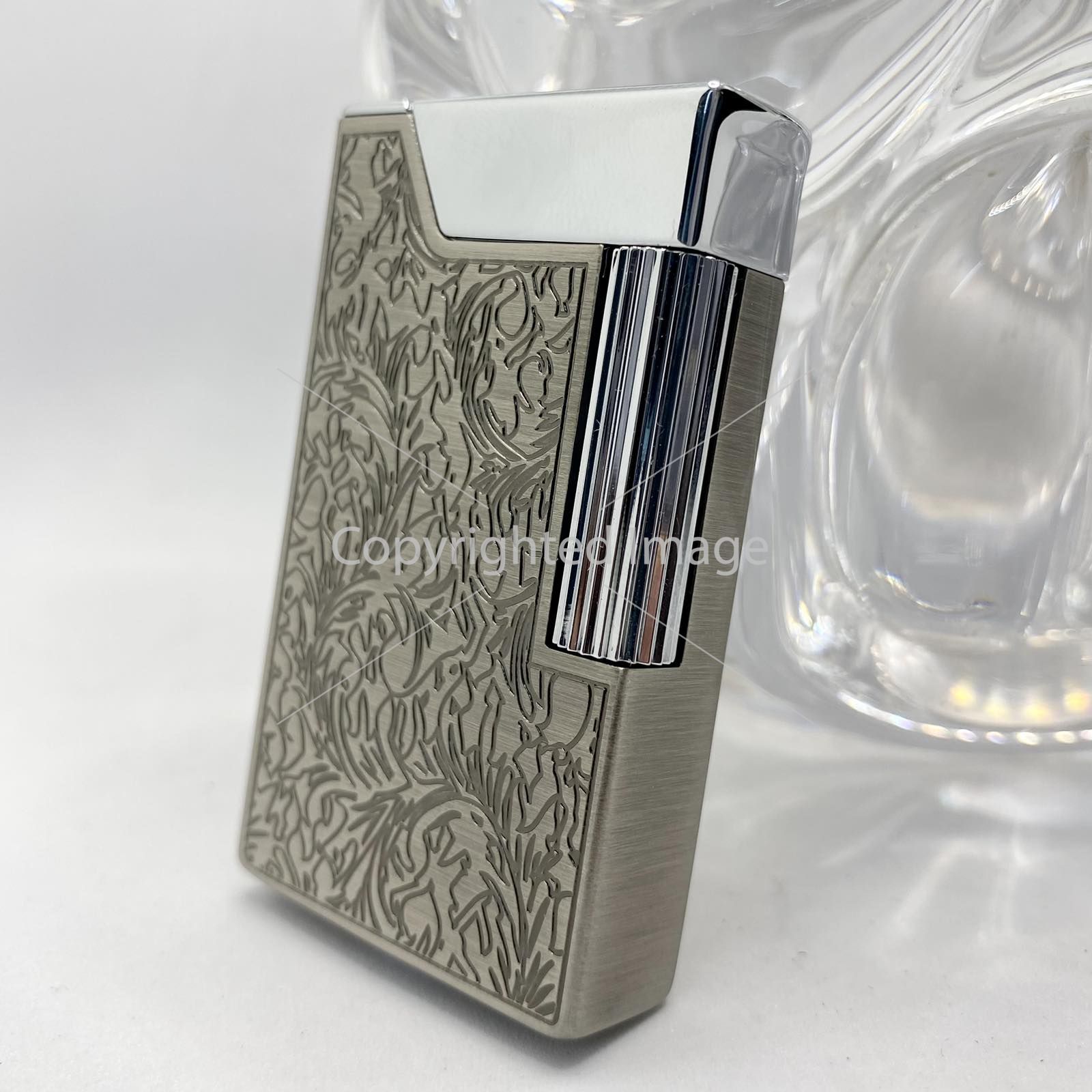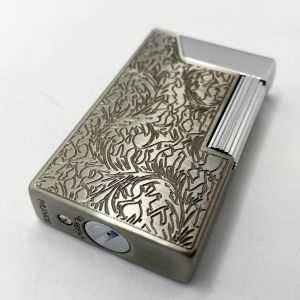Корпус запальнички привертає погляди завдяки своєму глибокому рельєфному гравіюванню. Складний рослинний орнамент на матовому темному металі контрастує з гладкими, хромованими елементами.