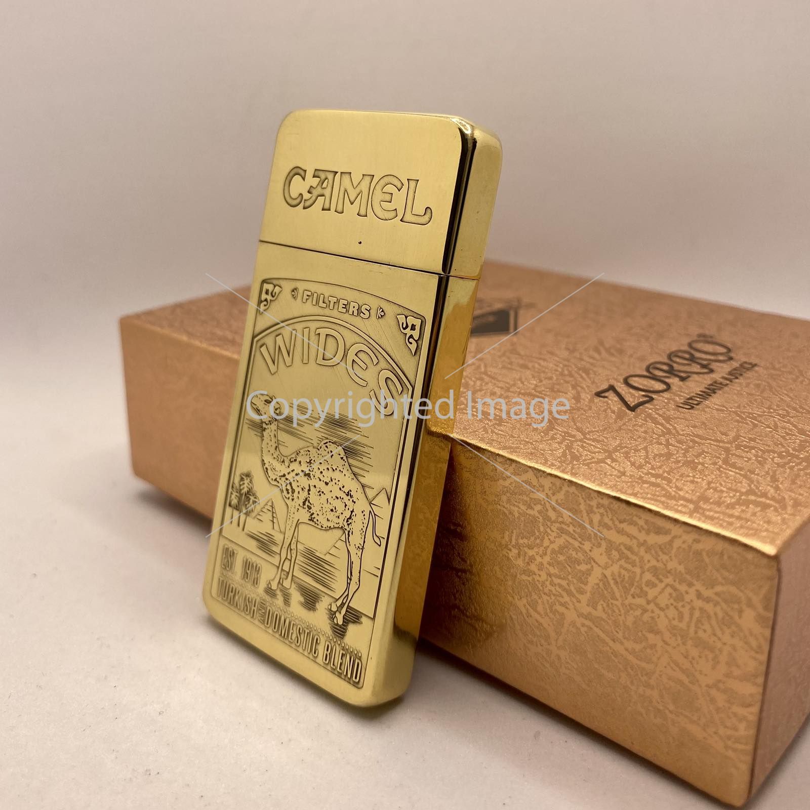 Ця бензинова запальничка ZORRO — не просто інструмент для вогню, а справжній чоловічий аксесуар з історією. Модель "CAMEL WIDES" виконана в розкішному золотистому кольорі та прикрашена деталізованим вінтажним гравіюванням, що відсилає до класичної тютюнової естетики.