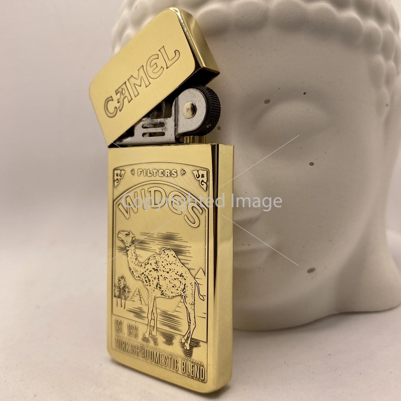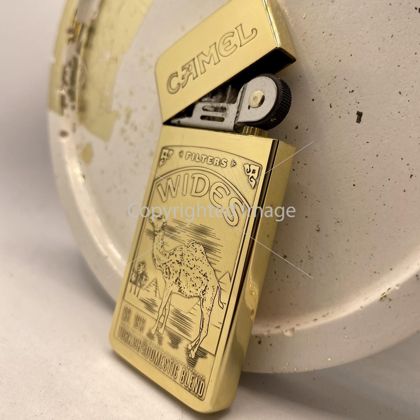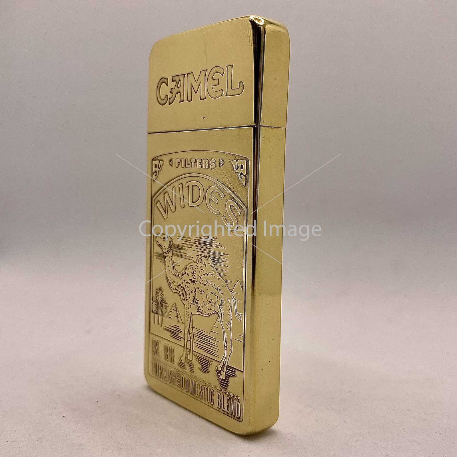 Розкішне Гравіювання: На лицьовій стороні зображено культовий сюжет — величний верблюд на тлі єгипетських пірамід та пальм, обрамлений написами "CAMEL", "WIDES", "EST. 1913" та "TURKISH DOMESTIC BLEND". Це не просто малюнок, а рельєфне художнє лиття, що додає запальничці глибини та преміального вигляду.