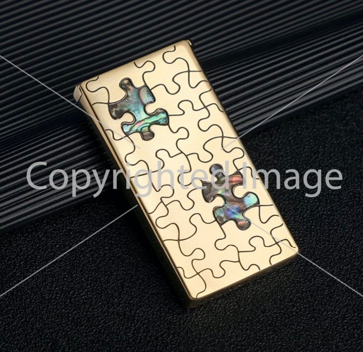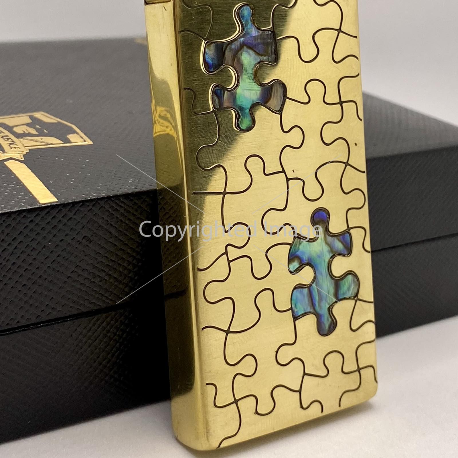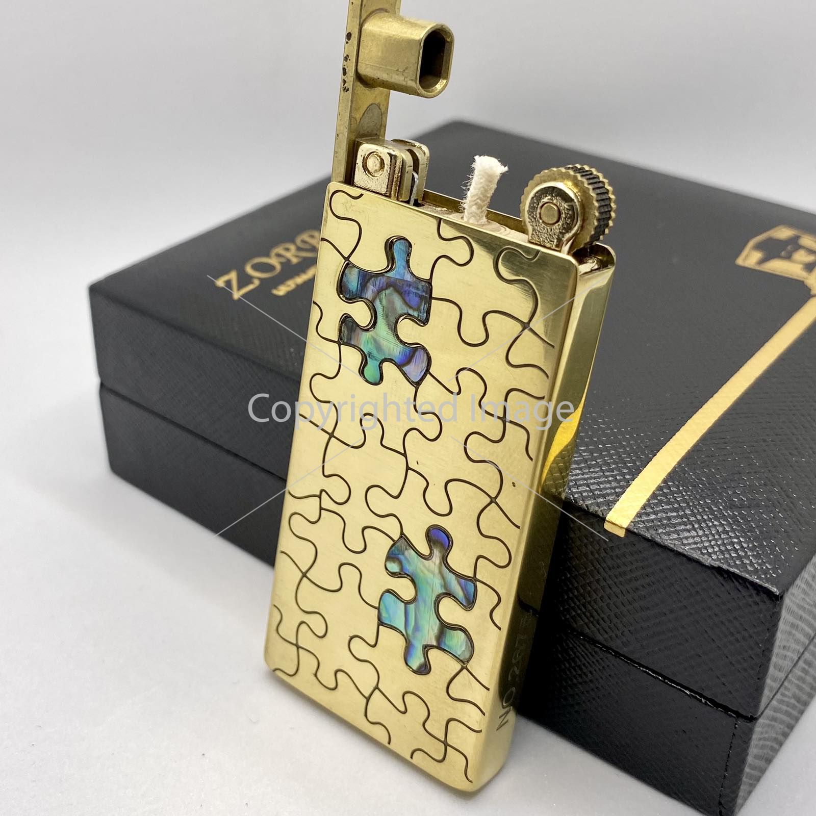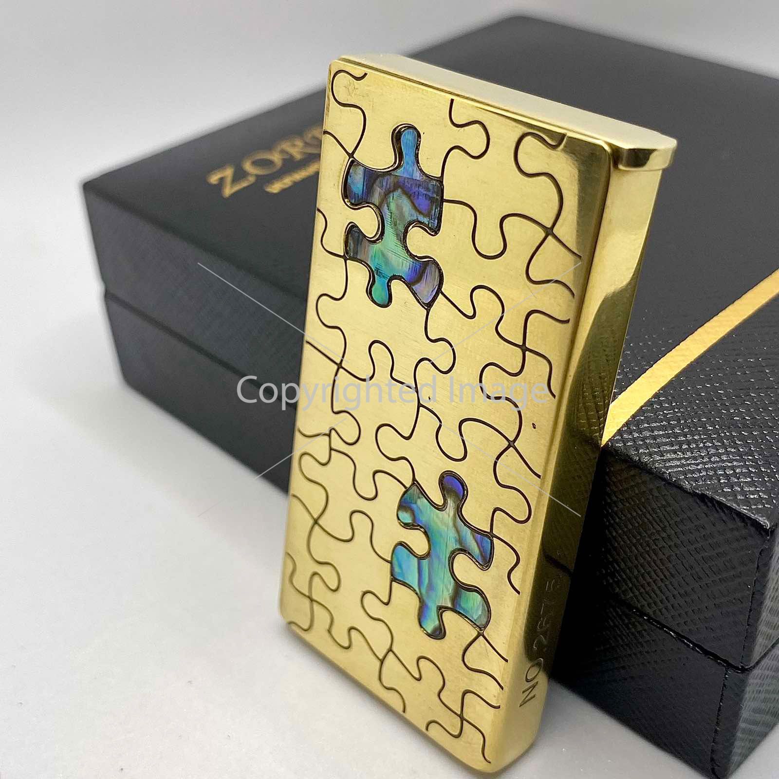 Ексклюзивний Дизайн "Puzzle": Корпус запальнички виконаний з високоякісної латуні (brass) у розкішному золотому кольорі, прикрашений рельєфним візерунком у вигляді елементів пазла.