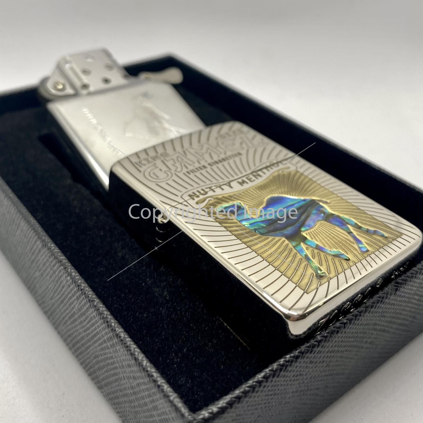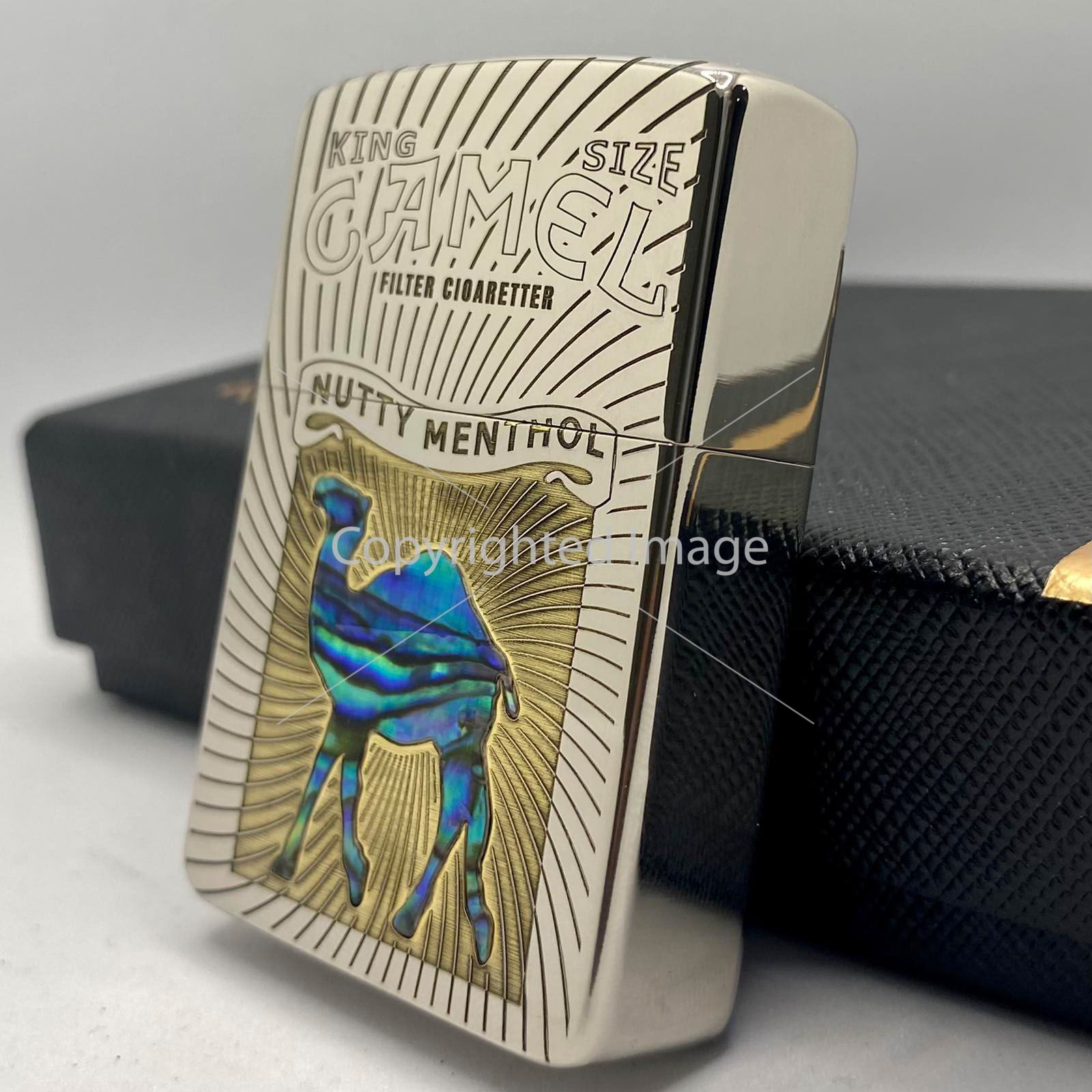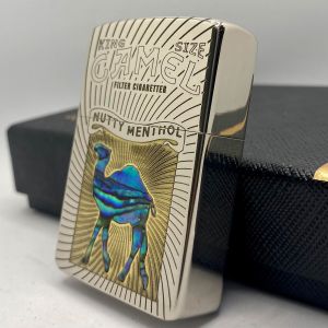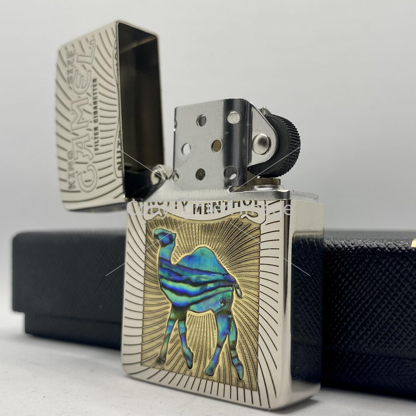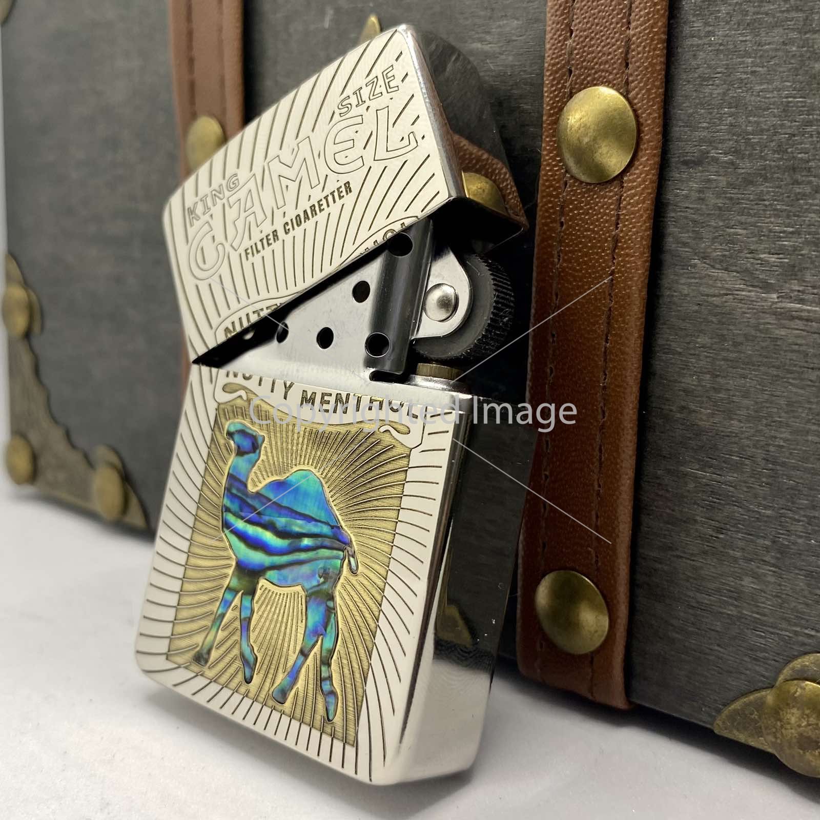 Магія Перламутру: Центральний елемент дизайну — легендарний верблюд Camel, виконаний у вигляді багатобарвної вставки з перламутрового композиту. Ця вставка неймовірно переливається на світлі, граючи глибокими відтінками синього, бірюзового та зеленого, що робить кожну запальничку унікальною.