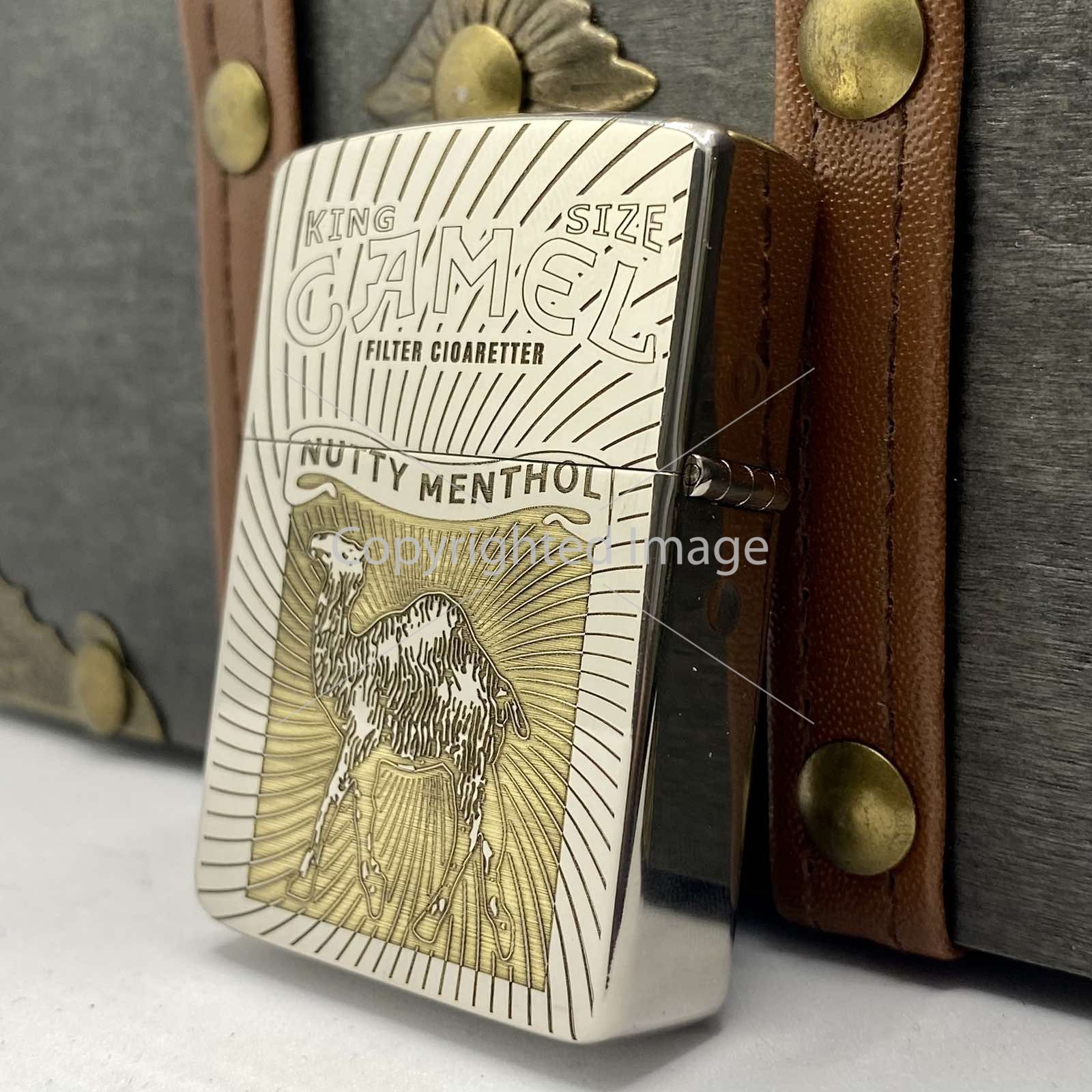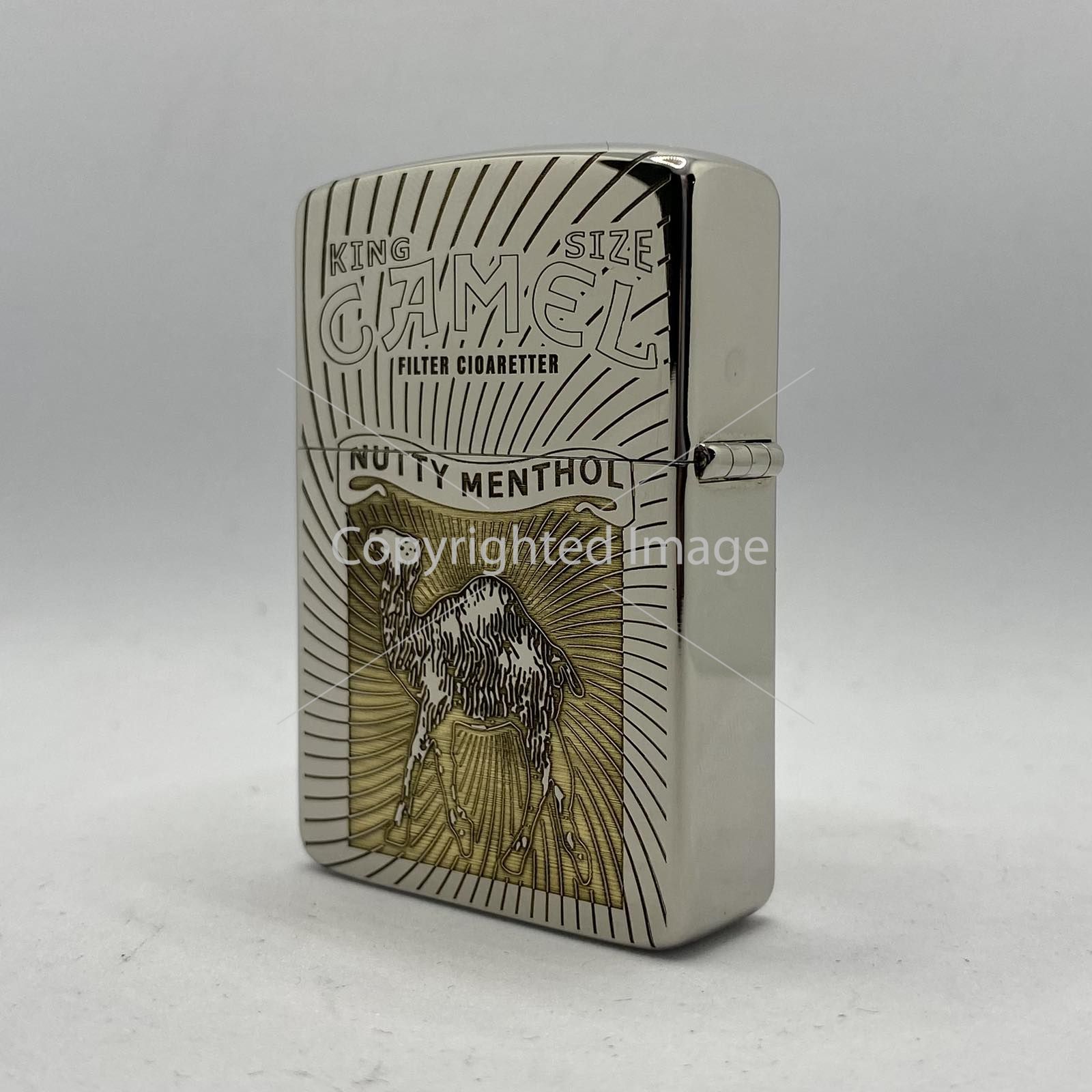 Розкішне Гравіювання: Корпус із полірованої сталі прикрашений високоточним глибоким гравіюванням у стилістиці вінтажних пачок сигарет: "KING SIZE CAMEL FILTER CIGARETTER" та "NUTTY MENTHOL". Вертикальні промені, що розходяться від верблюда, підкреслюють ретро-шик.
