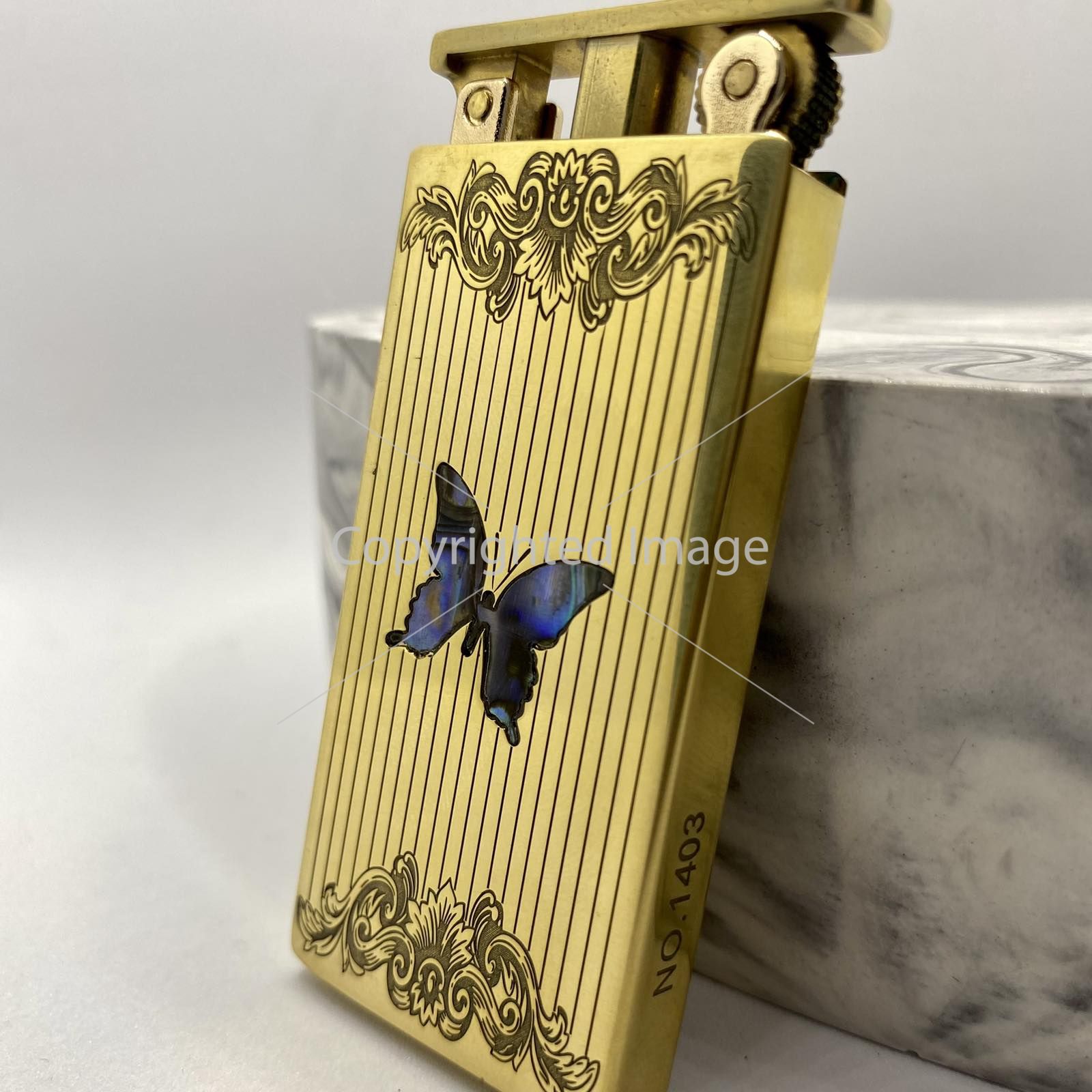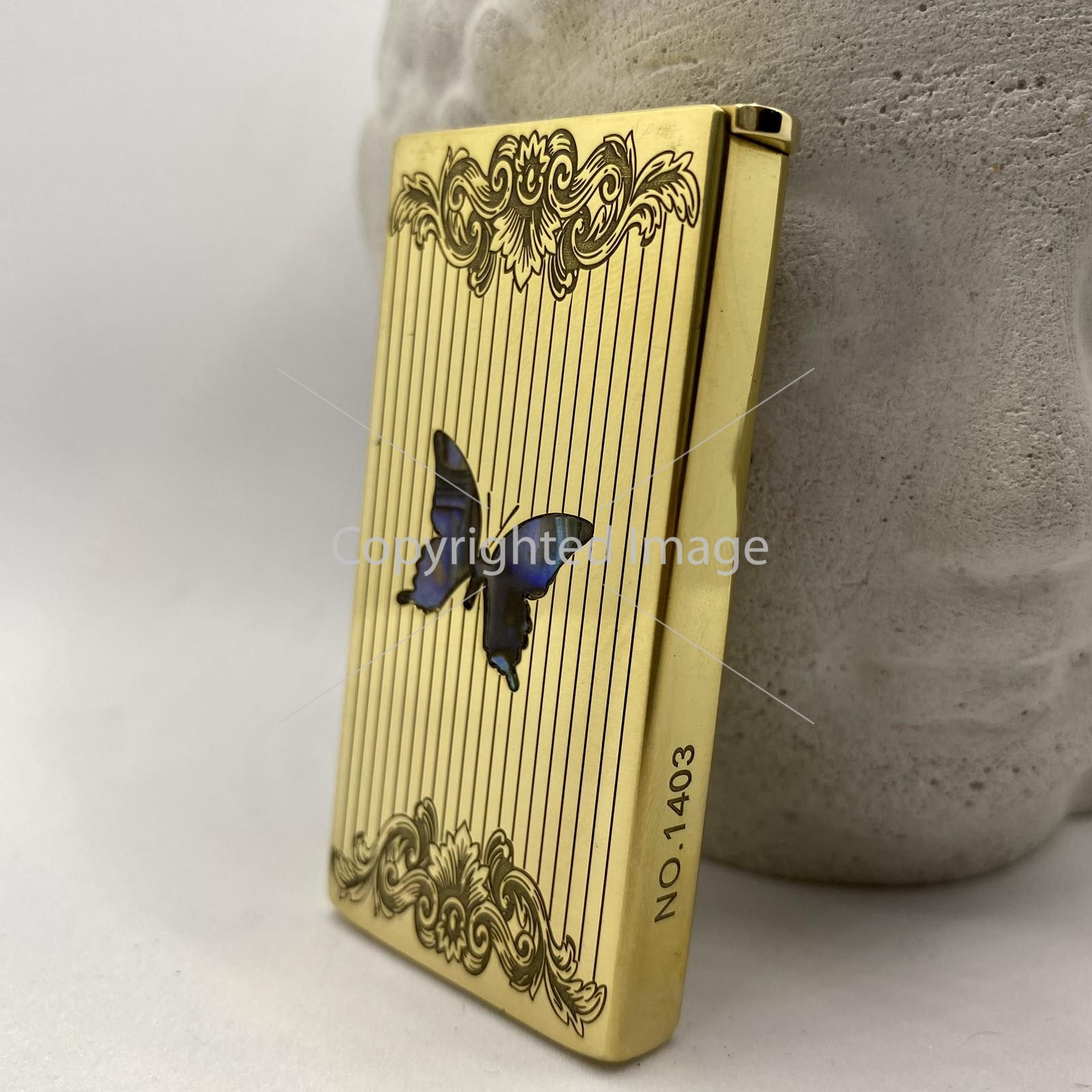 Вишукана Інкрустація: Центральну частину кришки прикрашає вставка у вигляді синього метелика, виконана з перламутрового матеріалу (або імітації черепашки). Це не просто малюнок, а справжня інтарсія, що надає запальничці колекційної цінності та унікальності.