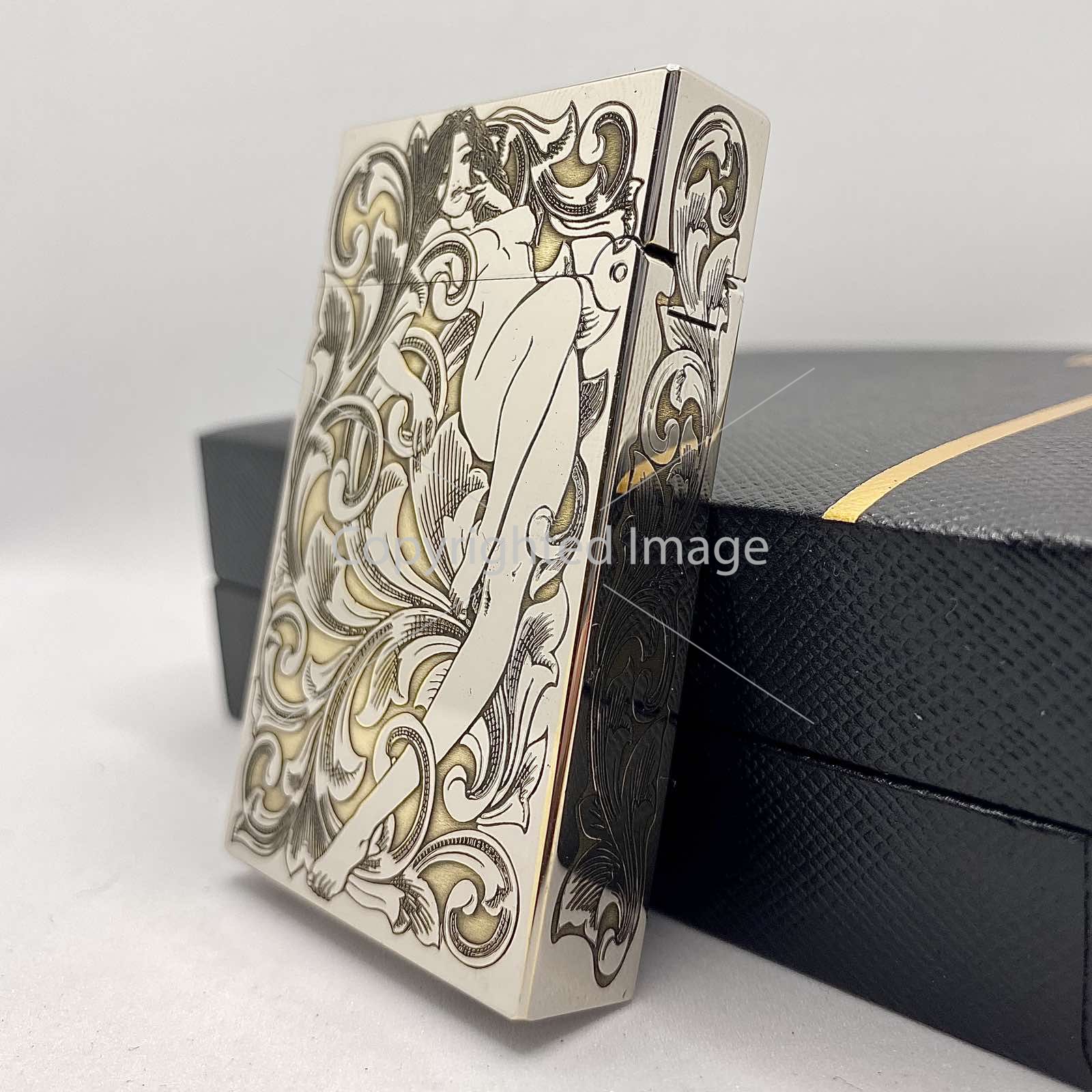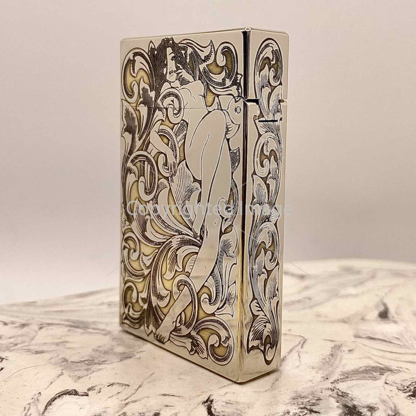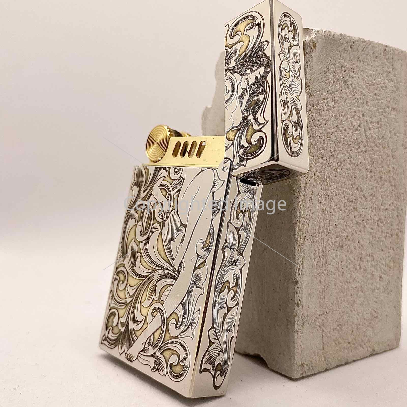 Ефект Контрасту (Ретро-Патина): Сріблястий, полірований рельєф різко контрастує із золотистим або латунним матовим фоном. Цей візуальний прийом підкреслює кожну лінію різьблення, надаючи запальничці вінтажного, антикварного вигляду.