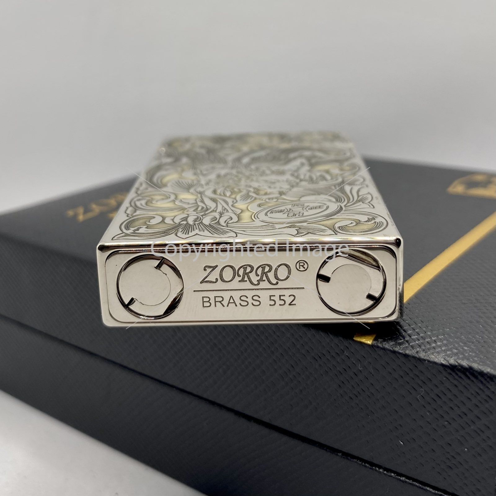 Міцний Металевий Корпус: Виготовлена з високоякісного металу (часто латунь або сплав), запальничка має посилену вагу і стійкість до зовнішніх пошкоджень, характерну для "броньованих" серій ZORRO.