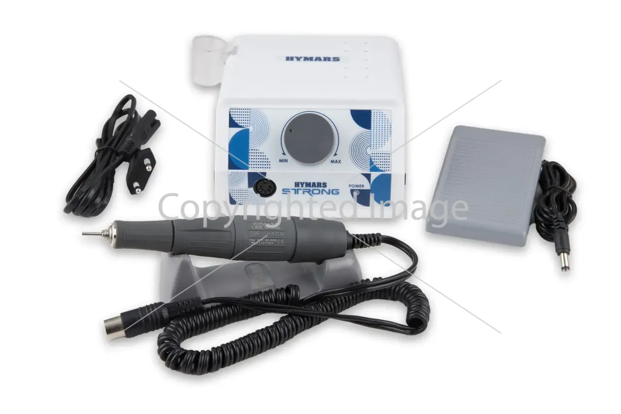 Опис Фрезер HYMARS модель Strong — це універсальний надійний апарат, що підходить для майстра манікюру та педикюру, для зубного техніка, ювеліра. Блок фрезера має підвищений захист від перегрівання та наявність автоматичної функції захисту від перевантаження — у разі перевантаження фрезер вимикається й не дає апарату вийти з ладу. Фрезер HYMARS Strong має функцію реверсу, яка дає змогу майстру працювати у двох напрямках, але не забувайте, що перемикання реверсу має здійснюватися тільки за вимкненого фрезера. Зміна напрямку під час роботи ручки може призвести до її ламання. На передній частині корпусу розташований роз'єм для під'єднання мікромотора, регулятор швидкості обертання фрези, кнопки OFF/ON і реверс. Фрезерний апарат укомплектований ручкою H37LN, максимальна робоча швидкість якої становить 40 000 об/хв, має невелику вагу 218 грамів і високий крутний момент 3.5 Н/см. З такими технічними характеристиками ручка може використовуватися не тільки для процедур манікюру, але й педикюру. Спрощений цанговий затискач Twist-Lock дає змогу змінювати насадки не більш ніж за 5 секунд. Для цього необхідно тільки провернути відповідну ділянку ручки вліво (відкриття цанги), замінити насадку та провернути ділянку назад (закриття цанги). Зверніть увагу! Не закривайте цангу без насадки. Це може призвести до зламання цангового затискача. Під час роботи ручка-мікромотор здійснює мінімальну кількість шуму та вібрації, тому майстру завжди комфортно працювати з нею. На корпусі розташовані кілька отворів для фрез, які майстер використовує найчастіше в роботі. Для цієї моделі фрезера передбачено керування ножем, яке можна вибрати (ручне або ножне) за допомогою перемикача «рука/педаль» на блоці. До комплекту також входить підставка-стаканчик, яка кріпиться до корпусу, настільна підставка для ручки фрезера, педаль для ножного керування Гарантія на ручку HYMARS H37LN-3 роки на блок HYMARS Strong -18 місяців
