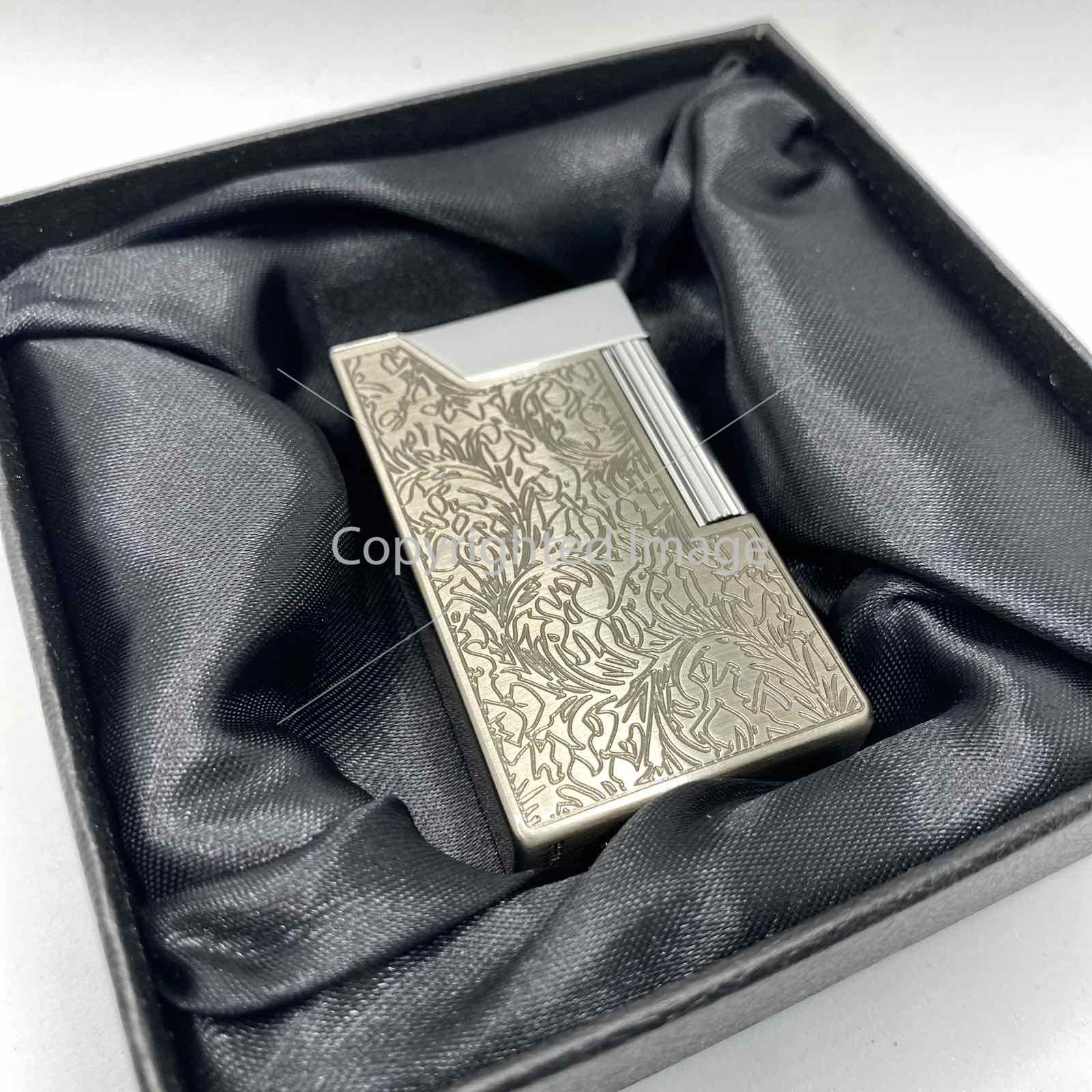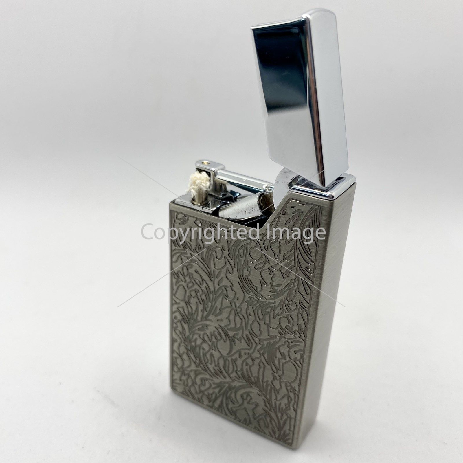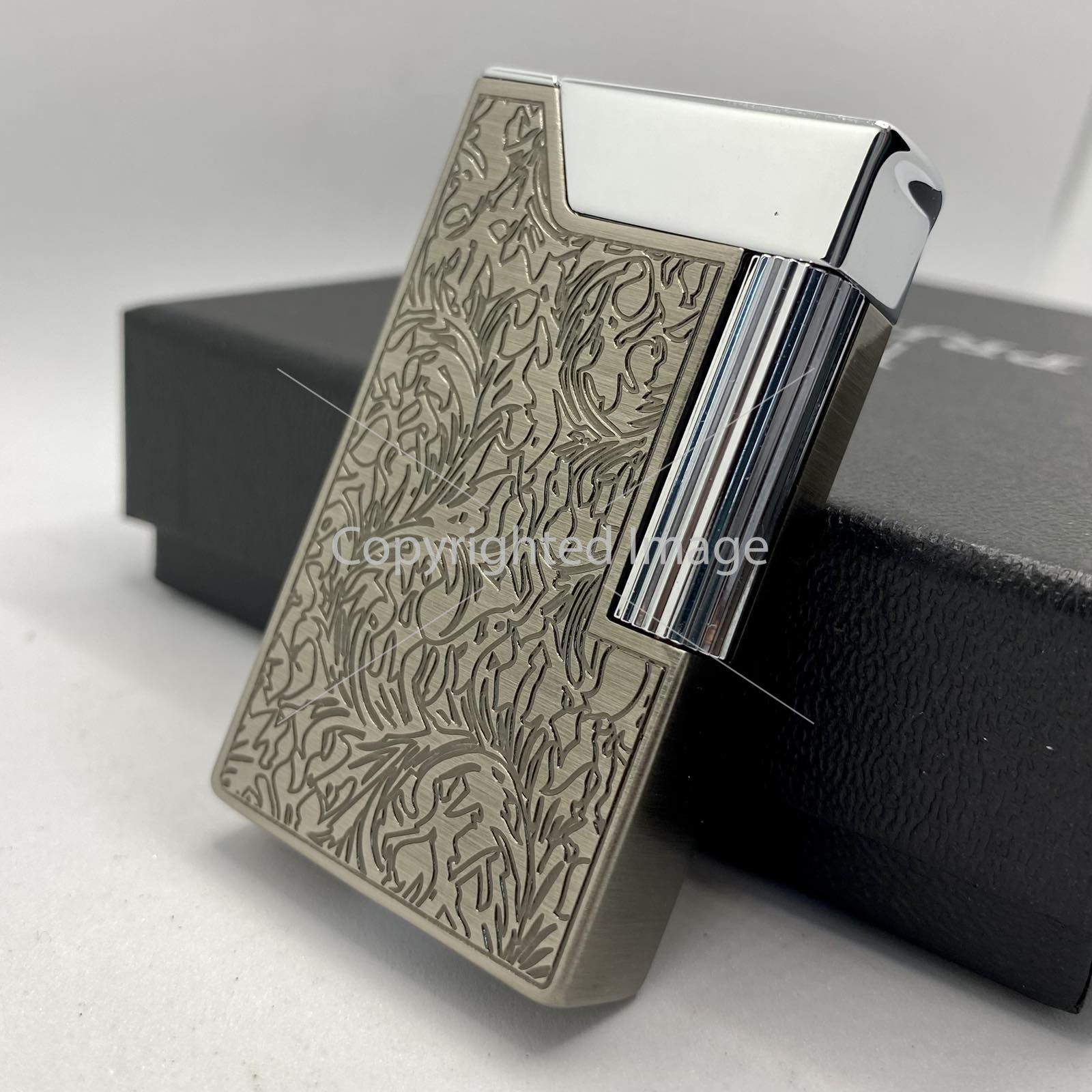 Корпус запальнички привертає погляди завдяки своєму глибокому рельєфному гравіюванню. Складний рослинний орнамент на матовому темному металі контрастує з гладкими, хромованими елементами.