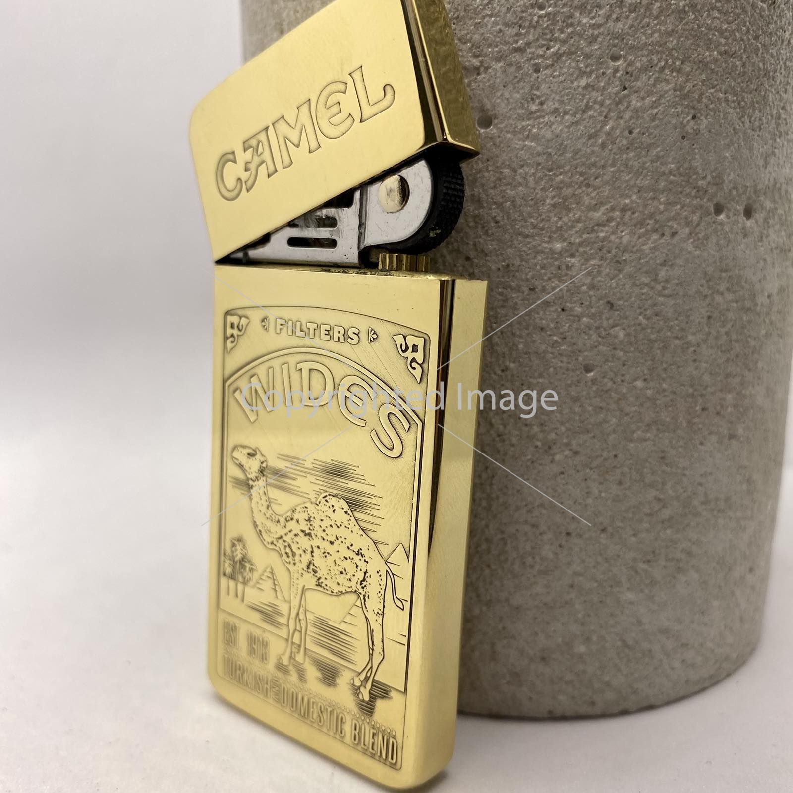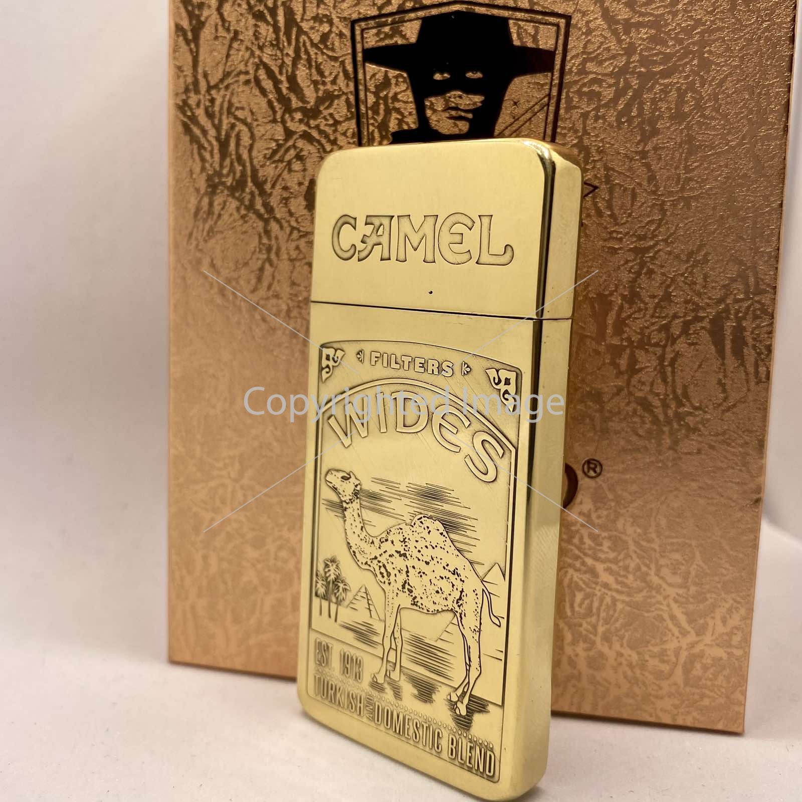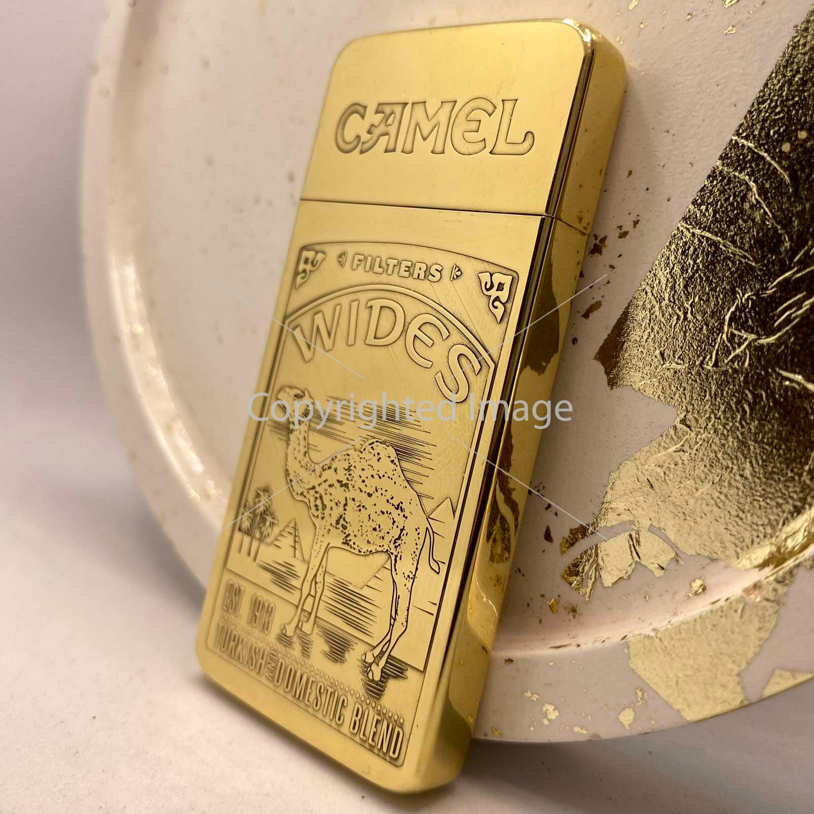 Розкішне Гравіювання: На лицьовій стороні зображено культовий сюжет — величний верблюд на тлі єгипетських пірамід та пальм, обрамлений написами "CAMEL", "WIDES", "EST. 1913" та "TURKISH DOMESTIC BLEND". Це не просто малюнок, а рельєфне художнє лиття, що додає запальничці глибини та преміального вигляду.