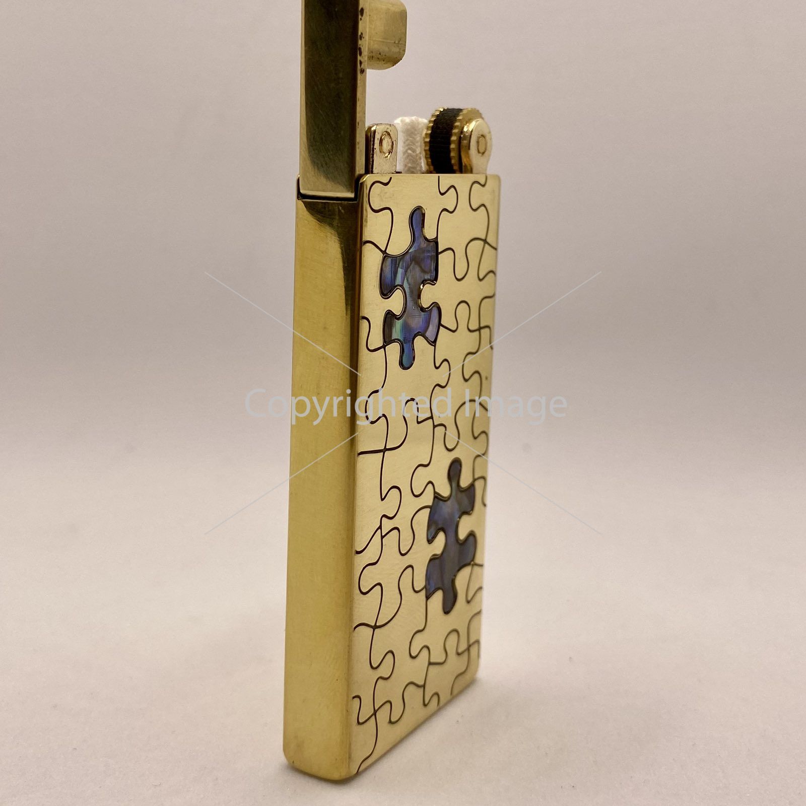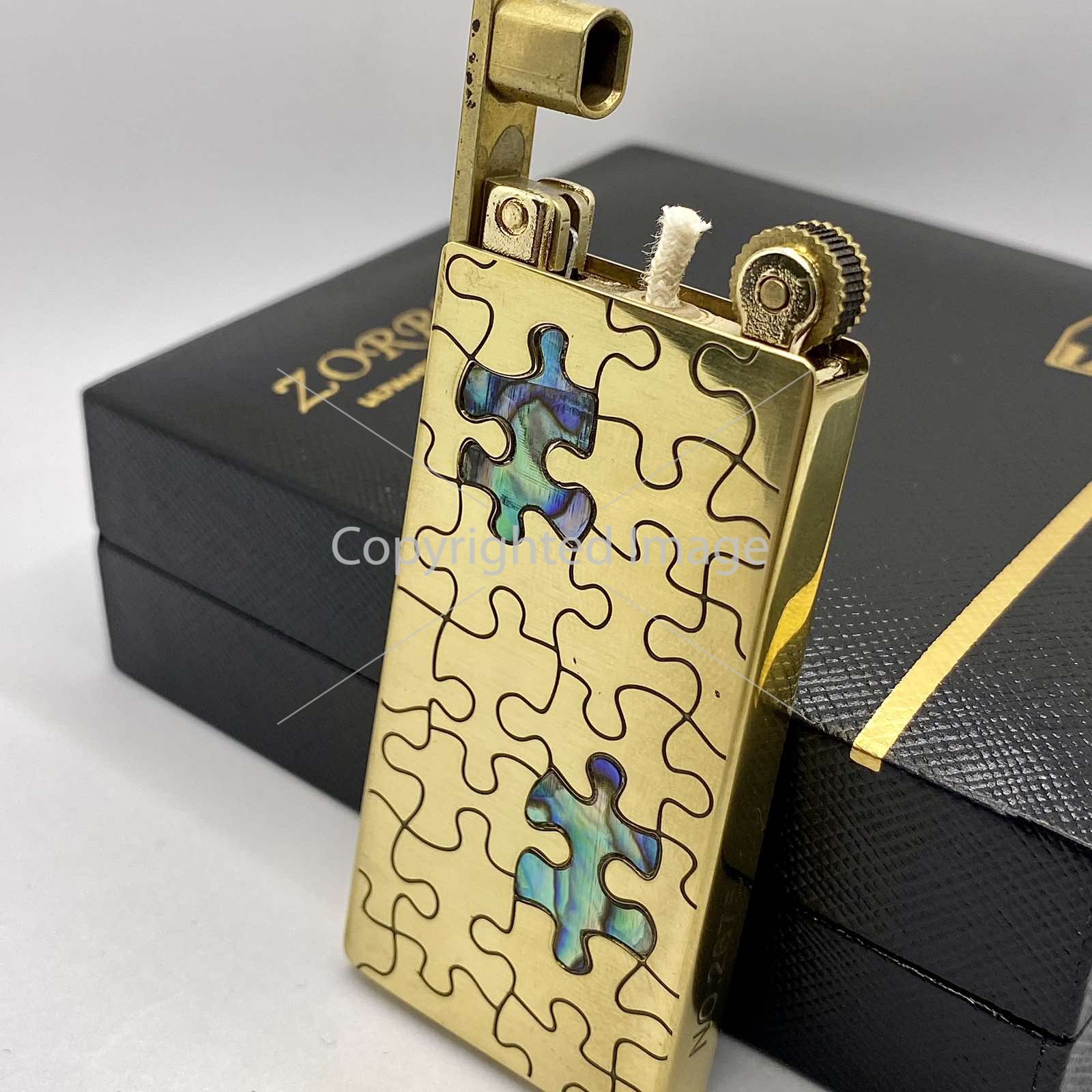 Ексклюзивний Дизайн "Puzzle": Корпус запальнички виконаний з високоякісної латуні (brass) у розкішному золотому кольорі, прикрашений рельєфним візерунком у вигляді елементів пазла.