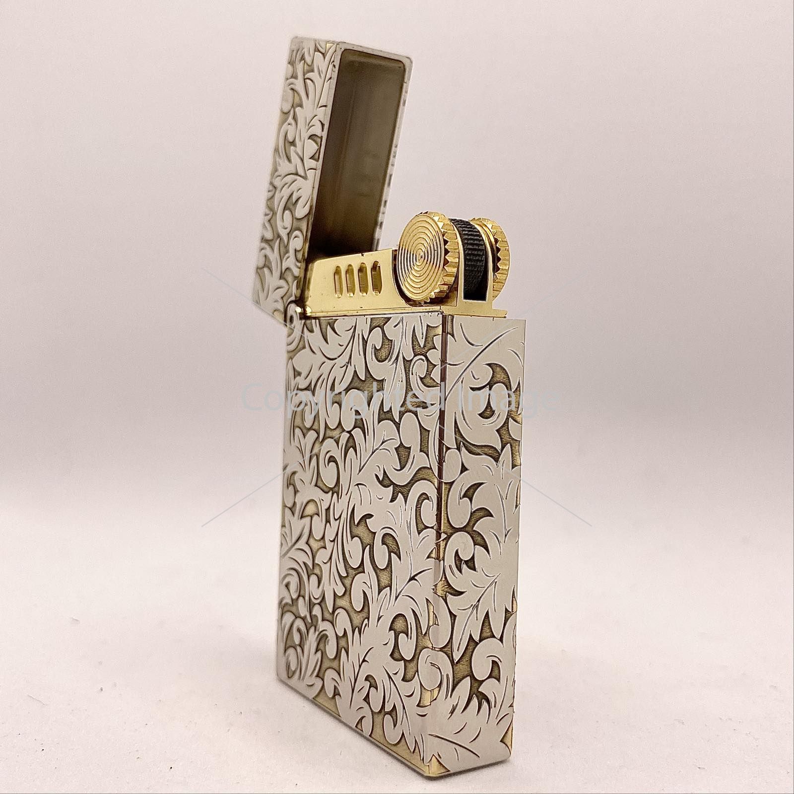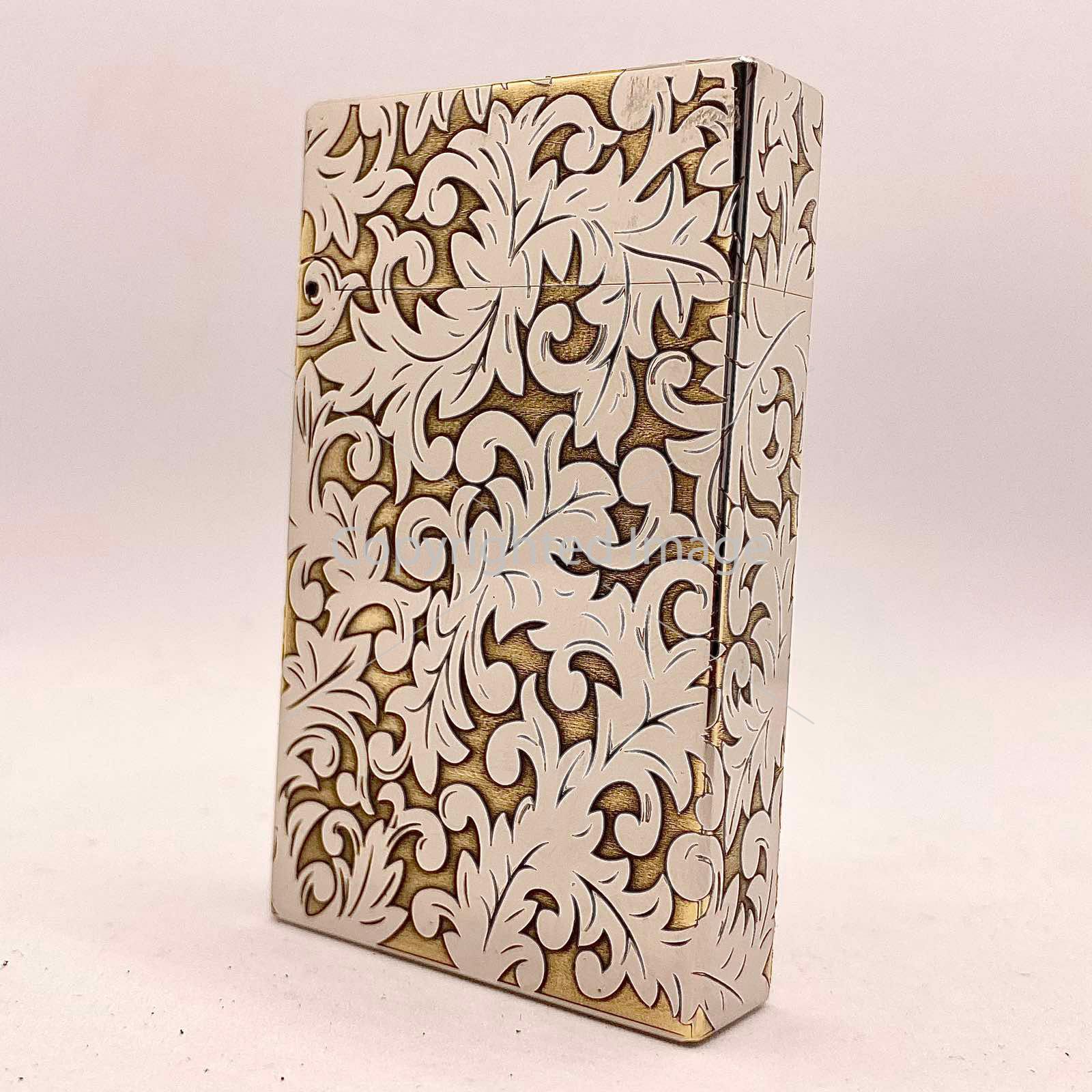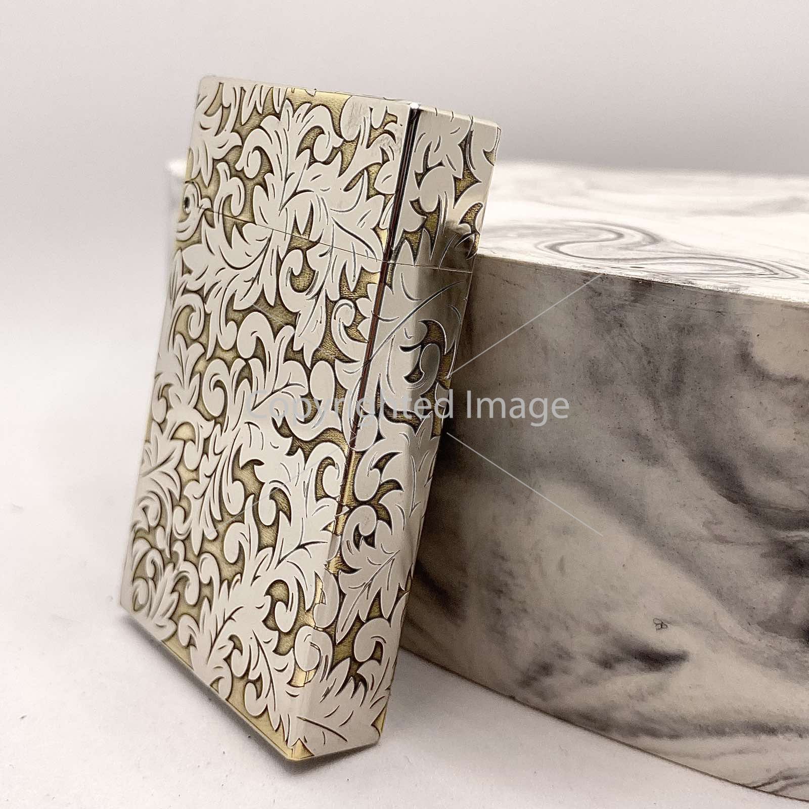 Глибоке Рельєфне Гравіювання: Корпус запальнички повністю вкритий складним, деталізованим візерунком у стилі бароко або флористичного орнаменту. Завдяки техніці глибокого гравіювання візерунок відчувається на дотик, створюючи ефект антикварного виробу.