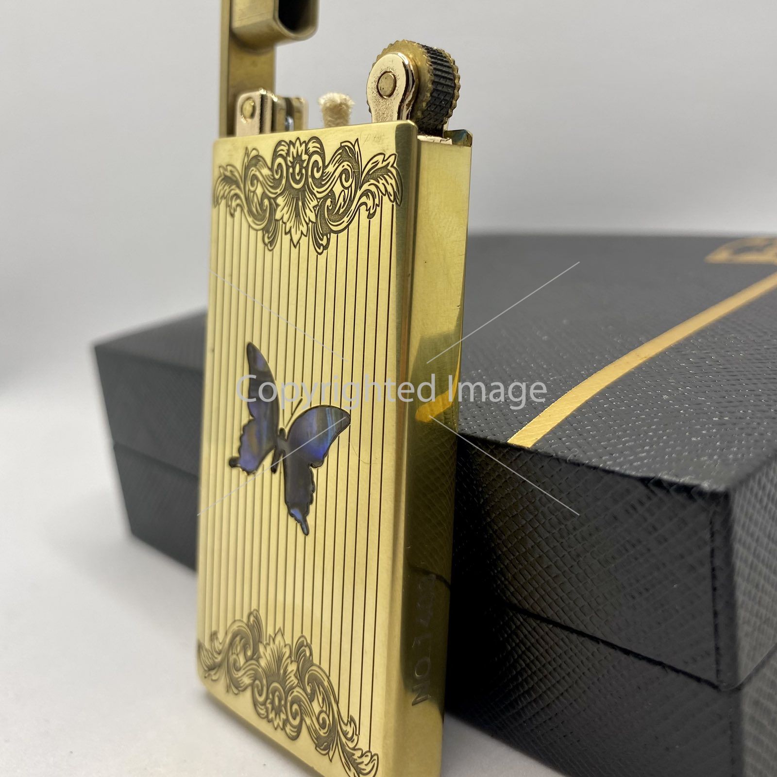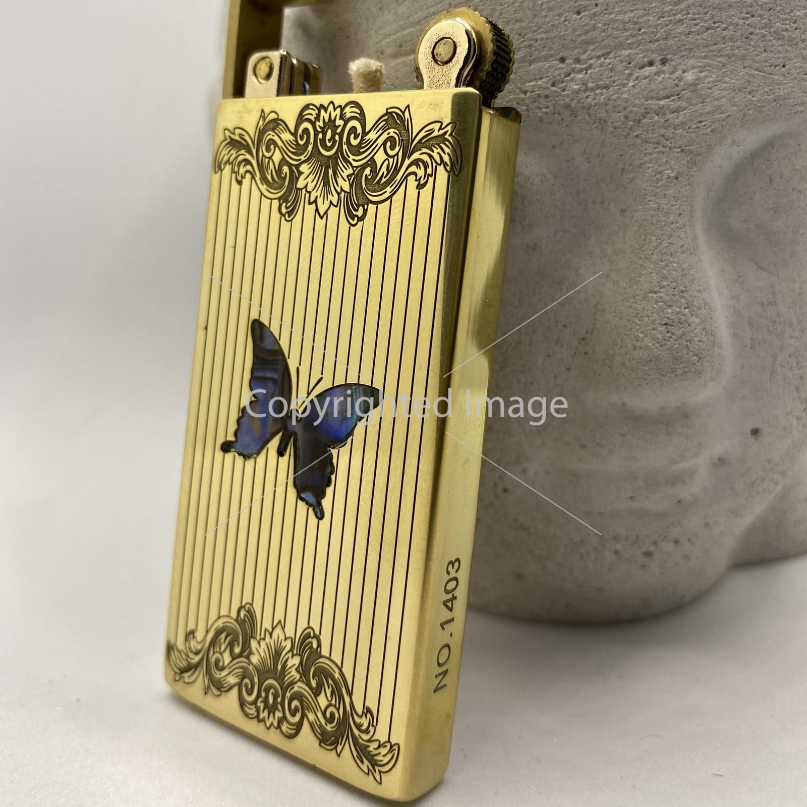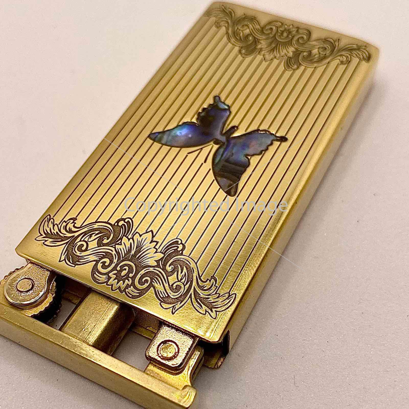 Вишукана Інкрустація: Центральну частину кришки прикрашає вставка у вигляді синього метелика, виконана з перламутрового матеріалу (або імітації черепашки). Це не просто малюнок, а справжня інтарсія, що надає запальничці колекційної цінності та унікальності.