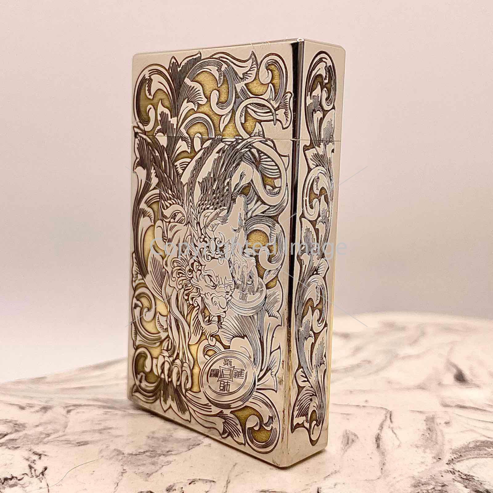 Ефект Контрасту (Ретро-Патина): Сріблястий, полірований рельєф різко контрастує із золотистим або латунним матовим фоном. Цей візуальний прийом підкреслює кожну лінію різьблення, надаючи запальничці вінтажного, антикварного вигляду.